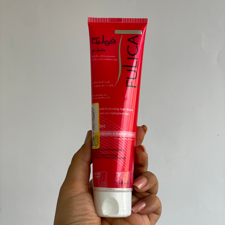 ماسک مو برند فولیکا، حجم 100 میلیلیتر، تثبیت کننده رنگ، تقویت کننده، ضد موخوره، براق کننده، سازگار با موهای رنگ و هایلایت شده، دارای عصاره انار و بورداک